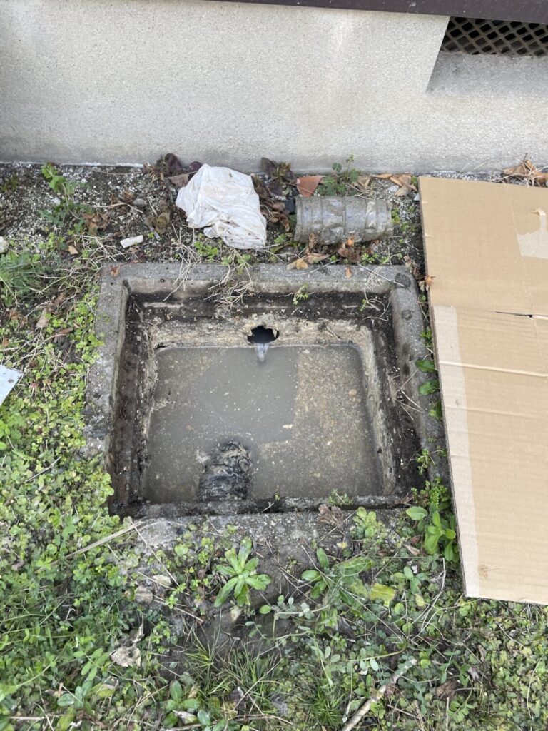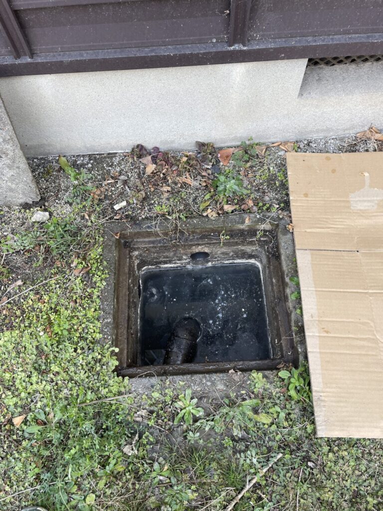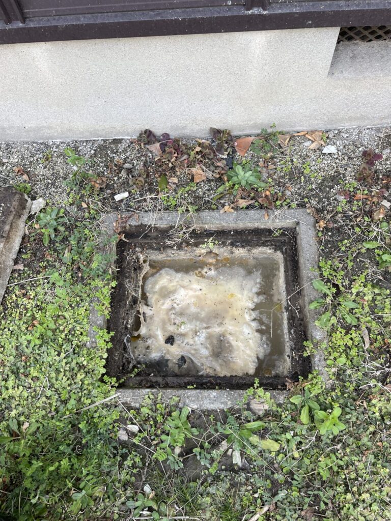 枡清掃もして解消しましたが、排水勾配が緩いのが原因だと説明をさせていただきましたが、