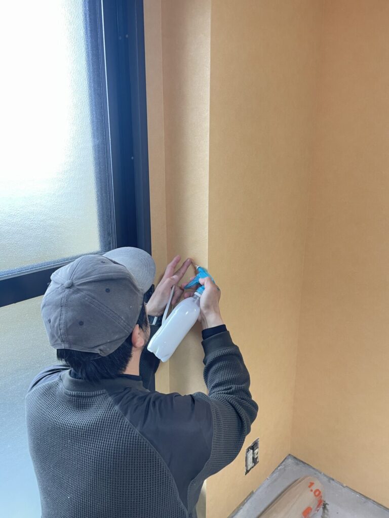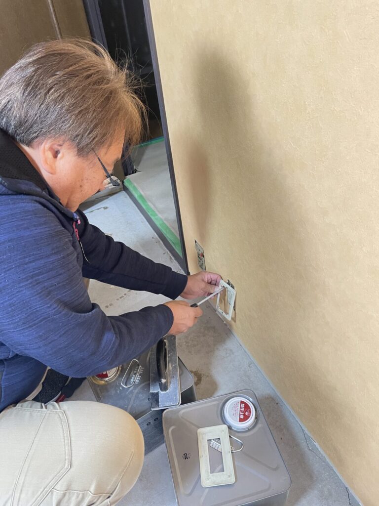 前日に張り上げたクロスの補修・スイッチプレート取付け・